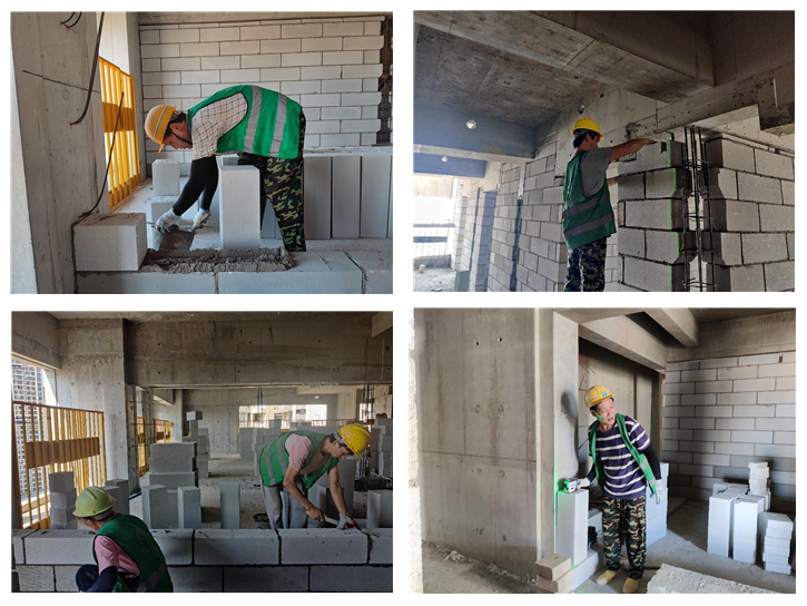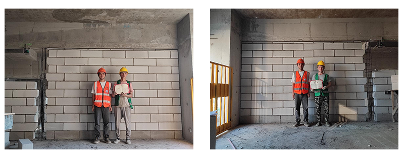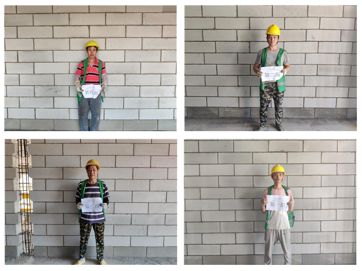为增强管理人员与现场作业人员的质量意识,努力提高工程质量,在项目开展了“质量月”砌筑技能大赛。技能大赛主要内容为现场实体砌筑,通过砌体的整体观感、垂直度、平整度、节点构造、灰缝饱满度及灰缝大小等进行量化打分评比,一共有4组选手参与了本次比赛。
